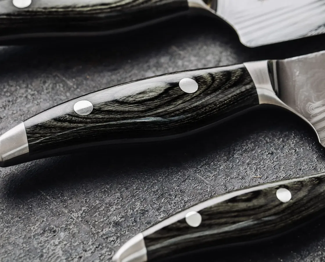 Der grauschwarz melierte Pakkaholz-Griff mit seiner symmetrischen Form ist für Links- und Rechtshänder geeignet und bietet einen sicheren und bequemen Halt.