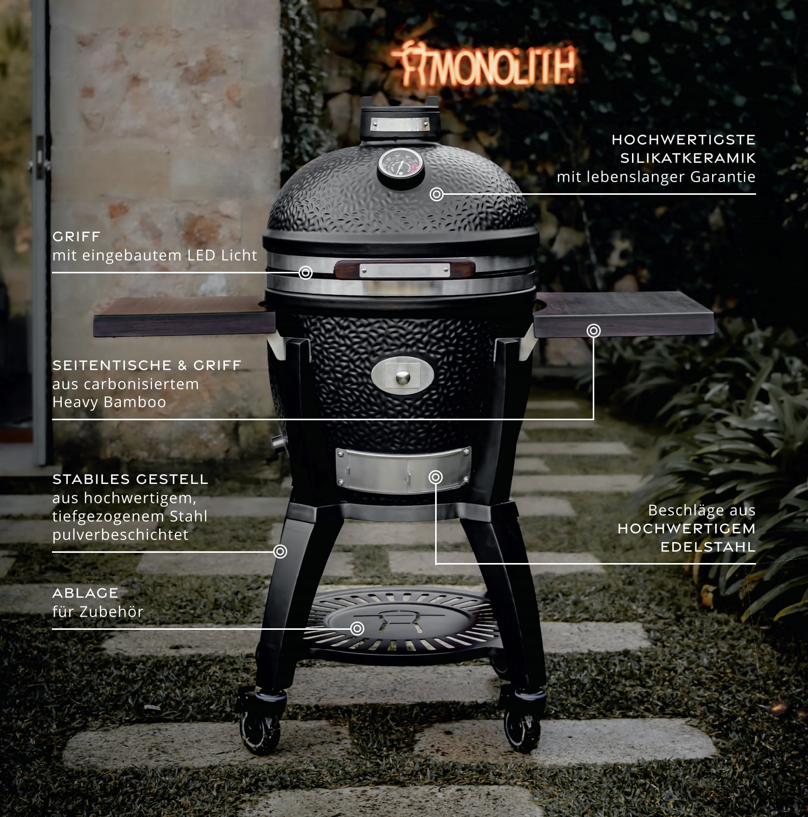 Matt-schwarze Silikat-Keramik, Edelstahlbeschläge und ein Heavy-Bamboogriff mit LED Licht. Entdecke den neuen Monolith Avantgarde jetzt im Grillfachwerk.