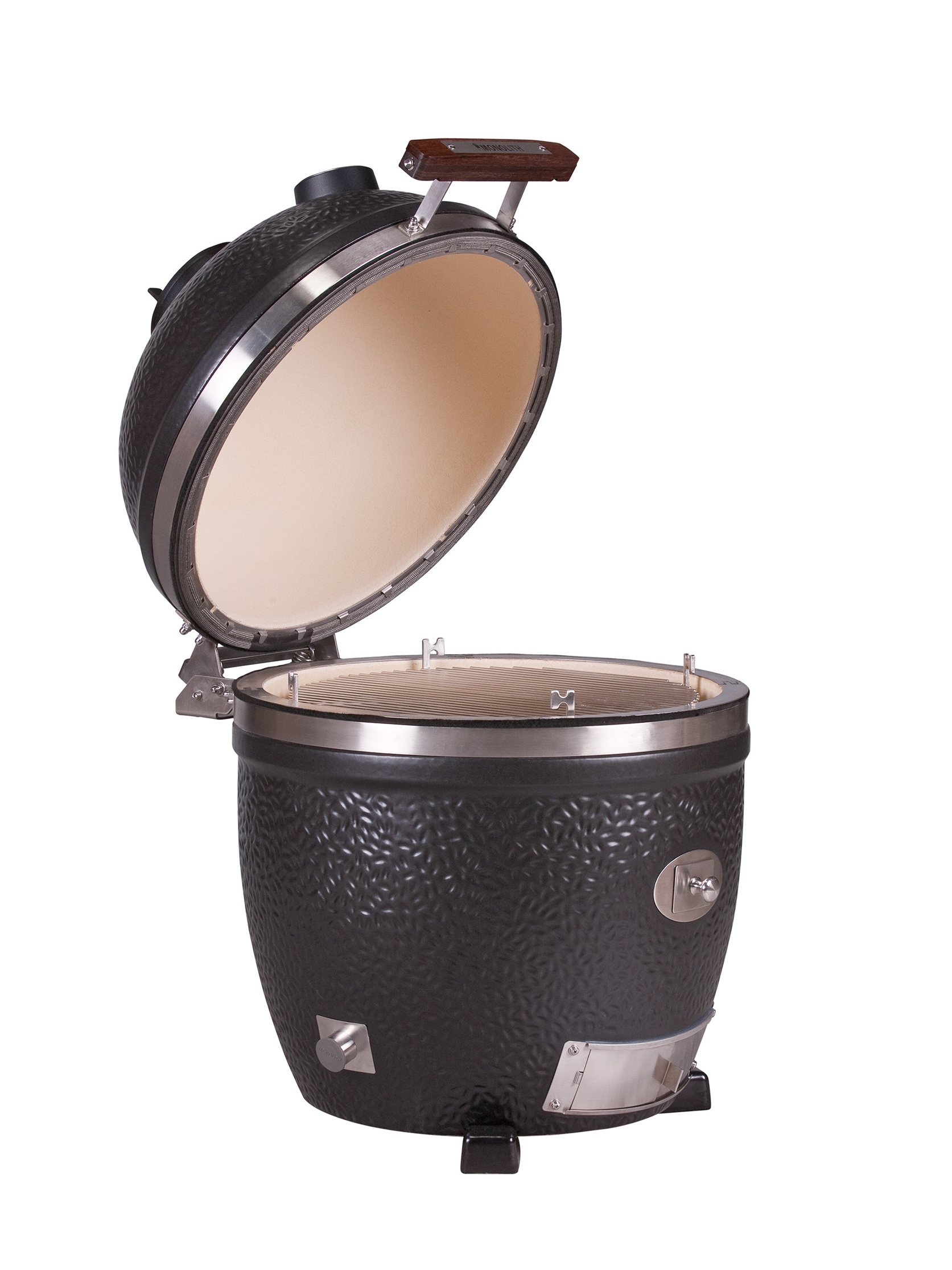Die hochwertige Silikatkeramik, mattgebürstete Edelstahlelemente, die Glasfaserdichtung und nicht zuletzt das integrierte LED Licht im Griff zeichnen diesen aussergwöhnlichen Kamado aus.